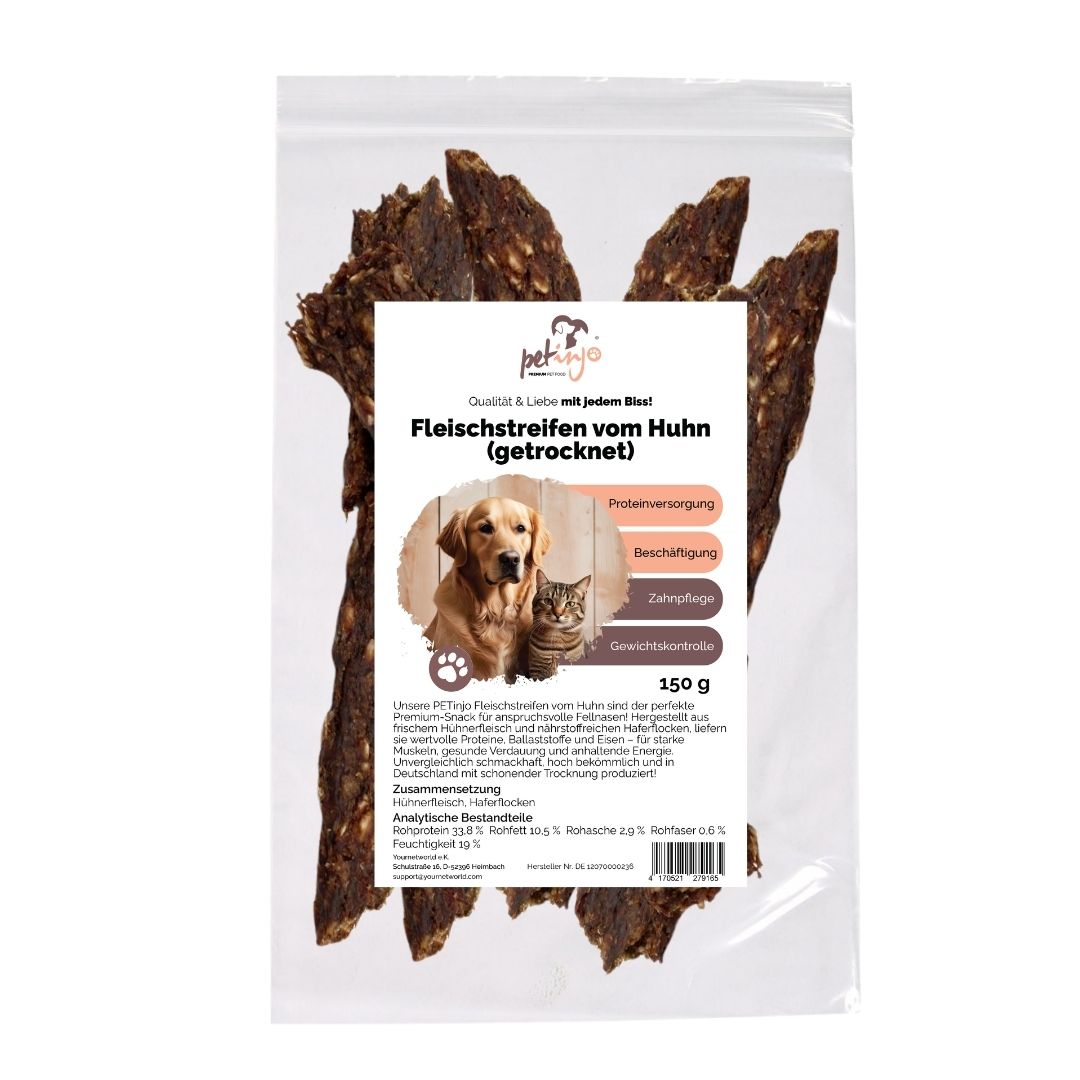 Unsere Hühnerstreifen sind ein hochwertiges Ergänzungsfuttermittel für Hunde und Katzen und eine ideale Ergänzung zum Hauptfutter. Achte darauf, die Menge des Hauptfutters entsprechend anzupassen, um eine ausgewogene Ernährung sicherzustellen.